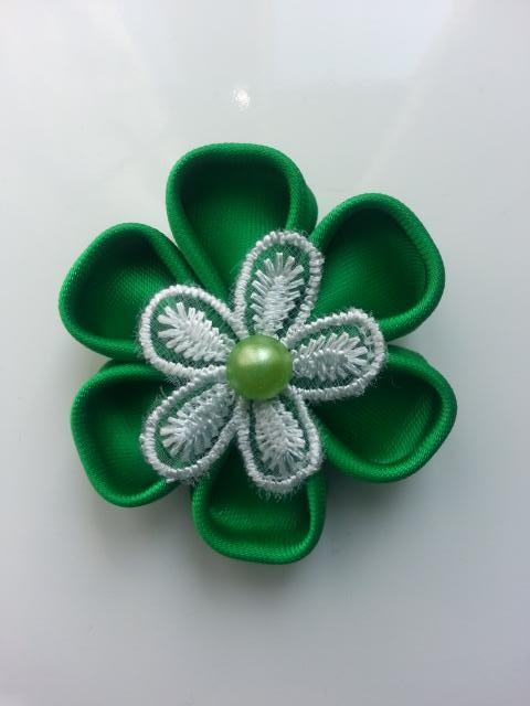 Fleur de satin et dentelle 5 cm dans les tons vert aux pétales ronds