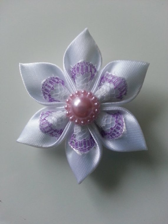 Fleur satin blanc et dentelle blanche et mauve 5cm