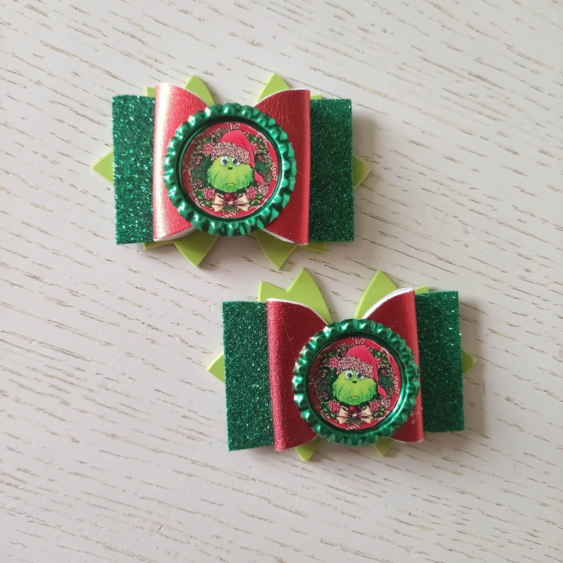 enfant noel rouge fille cheveux vert barrette crocodile noeuds grinch
